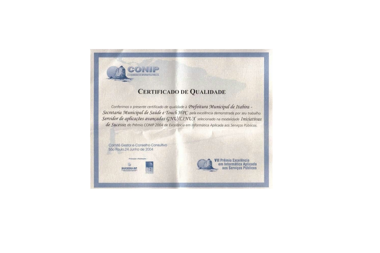 A Touch HPC Tecnologia Ltda, é Certificada como Excelência em Informática e Tecnologias Aplicadas aos Serviços Públicos na modalidade "Iniciativa de Sucesso" pelo Instituto CONIP de Gestão Fiscal, certificação recebida em 2004.